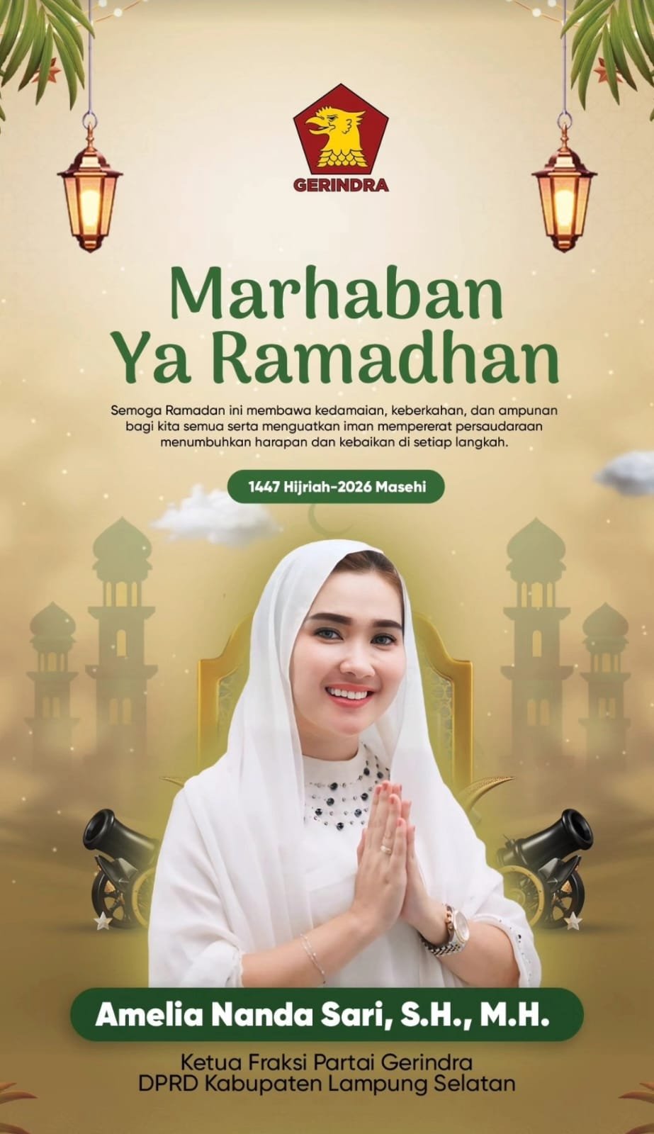 Lampung Selatan, NU MEDIA JATI AGUNG, — Menyambut datangnya bulan suci Ramadhan 1447 Hijriah/2026 Masehi, Ketua Fraksi Partai Gerindra DPRD Kabupaten Lampung Selatan, Amelia Nanda Sari, S.H., M.H., menyampaikan ucapan selamat menunaikan ibadah puasa kepada seluruh masyarakat.