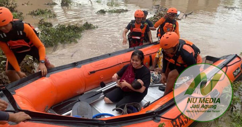 Lampung Selatan, NU Media Jati Agung β Basarnas Lampung evakuasi warga terjebak banjir di Desa Jatimulyo dan sejumlah perumahan di Kecamatan Jati Agung, Kabupaten Lampung Selatan, setelah hujan deras mengguyur wilayah tersebut pada Jumat (6/3) sore.