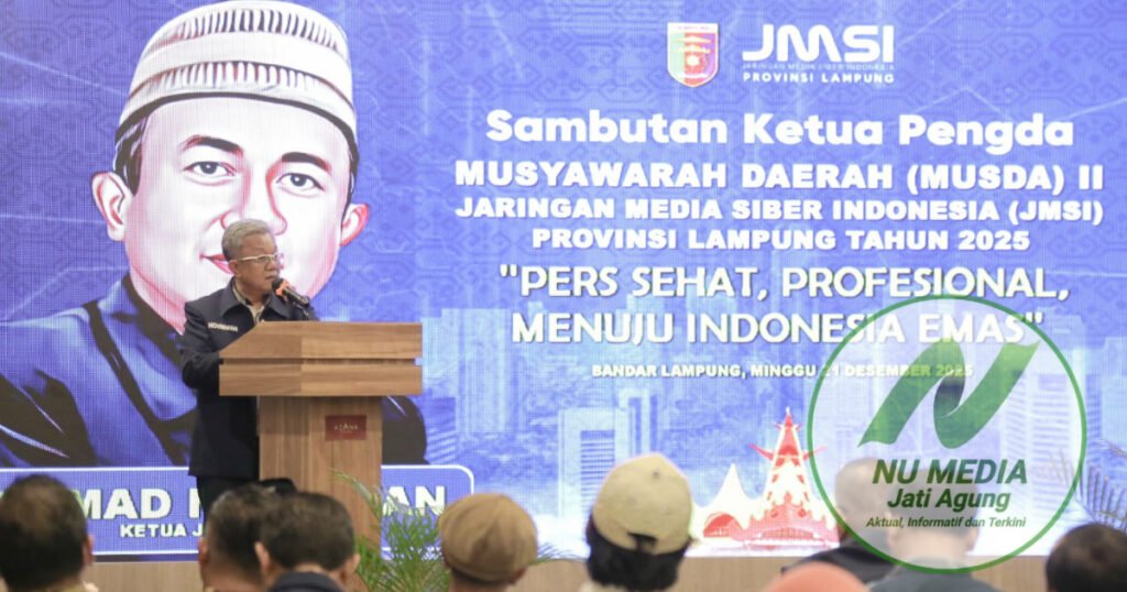 Bandar Lampung, NU Media Jati Agung — Jaringan Media Siber Indonesia (JMSI) Lampung menggelar Musyawarah Daerah (Musda) ke-II dengan tema “Persamaan Sehat, Profesional, Menuju Indonesia Emas” di Hotel Azana, Jalan Jenderal Sudirman No. 67, Rawa Laut, Enggal, Kota Bandar Lampung, Ahad (21/12/2025).