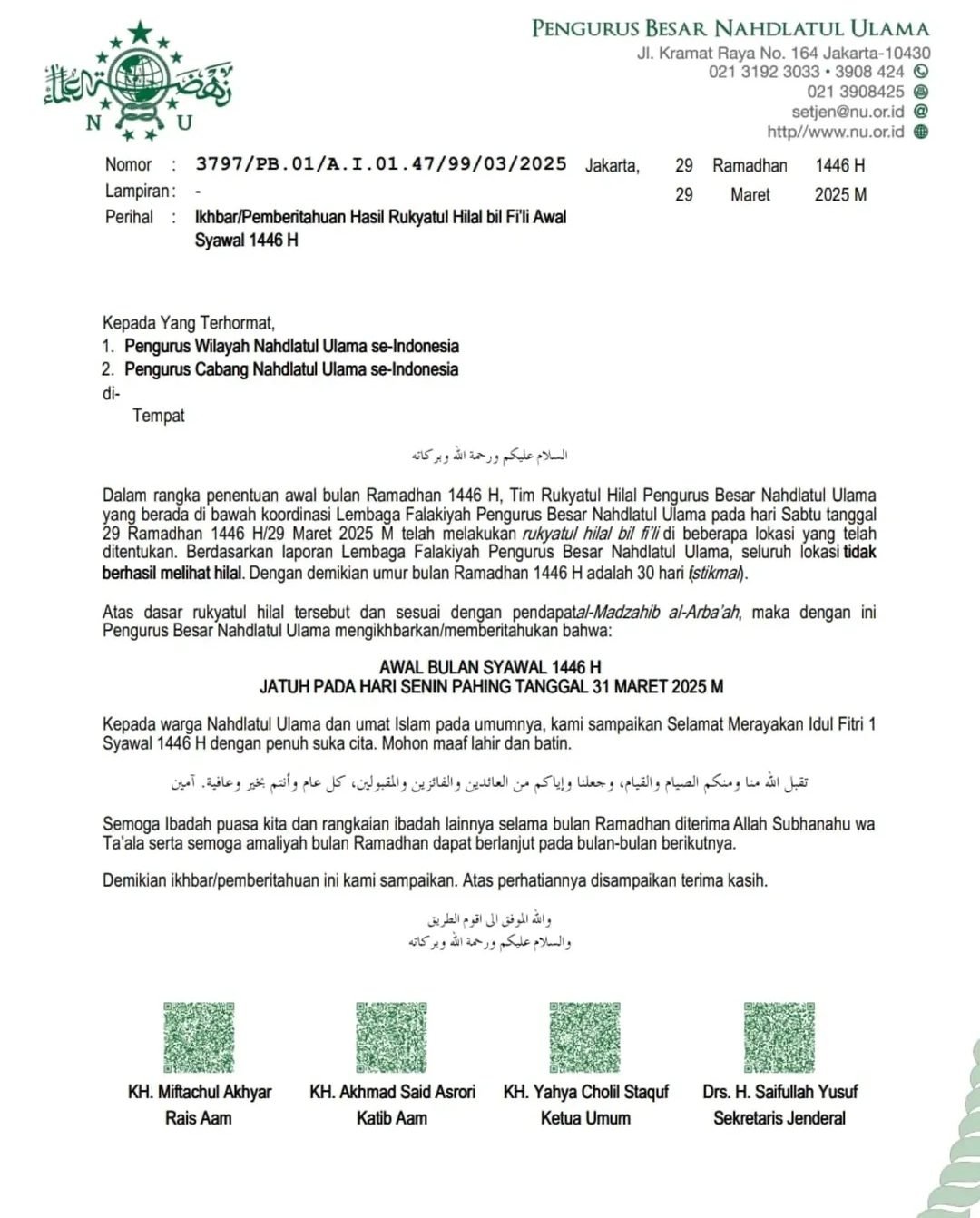 Dengan pengumuman ini, PBNU berharap seluruh umat Islam di Indonesia dapat bersiap menyambut Idul Fitri dengan hati yang bersih, penuh kebahagiaan, dan tetap menjunjung tinggi nilai-nilai Islam dalam kehidupan sehari-hari.