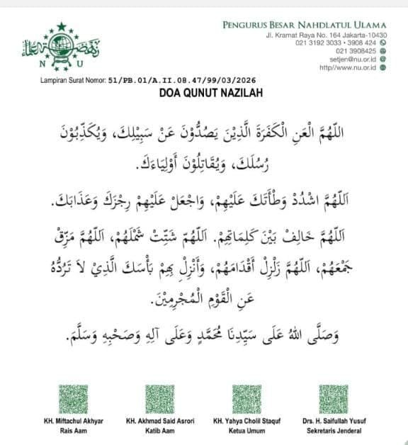 Surat tertanggal 11 Ramadhan 1447 H atau 1 Maret 2026 M itu mengimbau seluruh jajaran Pengurus Nahdlatul Ulama untuk melaksanakan pembacaan Qunut Nazilah dalam setiap shalat fardhu secara konsisten.